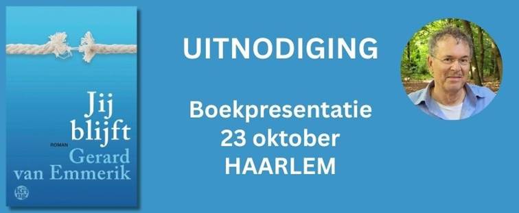 Hierbij nodig ik u namens Gerard van Emmerik graag uit voor de boekpresentatie van Jij blijft. De presentatie zal plaatsvinden op donderdagmiddag 23 oktober van 17 tot 19 uur bij boekhandel De Vries van Stockum, Jacobijnestraat 7 in Haarlem. Inloop vanaf